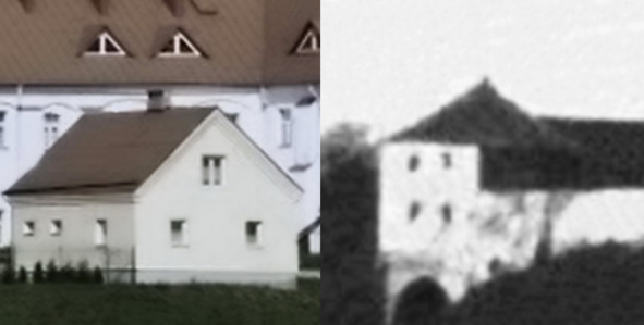 Дом-башня, с плана 1804 года, был связан коридором с корпусом монастыря, из которого в строение ходили по особым случаям. В этом небольшом здании, расположенном на краю горы, помещались баня и… туалет. На плане помещение, обозначаемое в XXI веке буквами WC, названо красивым словом «prywety». К слову, другие названия для таких мест звучали не менее поэтично «wygódka», «wychodek», «potrzebna kamorka». Монахи, разумеется, тоже нуждались в удовлетворении простых человеческих потребностей. На месте башни-домика стоит скромная постройка, видимо, использующая фрагменты стен той самой, старой, «туалетной» башни.