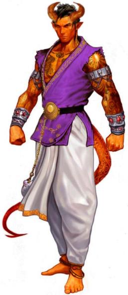 Оранжевая кожа. Изукрашенное татуировками тело. Даже гибкий хвост имел узоры. Свободные тканные одежды. Видимо, по классу латы и кольчуги не положены. Только металлические браслеты на предплечьях и бицепсах. Не видно и оружия.