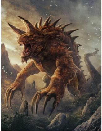 Вот только в отличие от Ти-Рекса, у этого колосса росли вполне функциональные и полноразмерные передние лапы с длинными когтями на конце. Ими он и пропахал те самые борозды на земле в стойбище Гремящего пика. Ими же он прямо на ходу загребал вековые деревья, отправляя их себе в бездонную пасть. Лёгкая закуска. Как чипсы. За собой гигант оставлял настоящую просеку в древнем лесу.