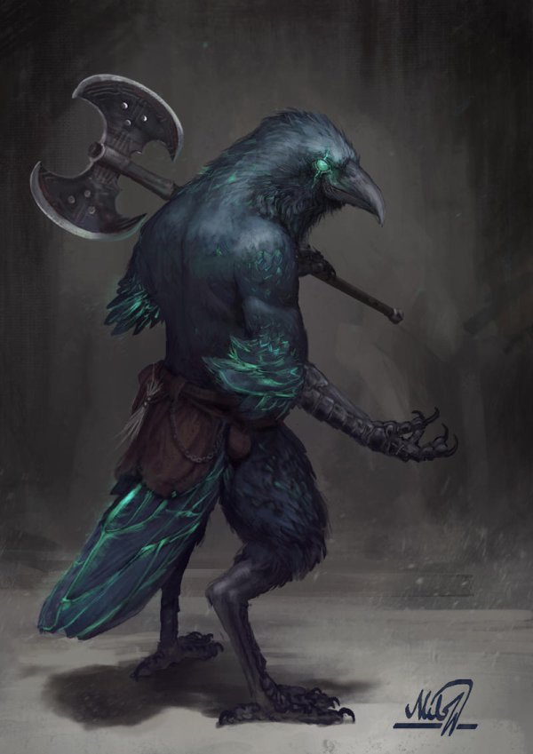 Высокий, по меркам кенку, здоровяк – метр восемьдесят, не меньше. Перья при каждом шаге обтягивали тугие мускулы. Никаких доспехов, если не считать набедренной повязки. Изумрудные всполохи энергии прокатывались по его телу, на миг застывая на кончиках перьев и в глазах. Один из которых когда-то выбили метким ударом – грубый шрам перечёркивал его морду. В руках массивная секира с двумя лезвиями.