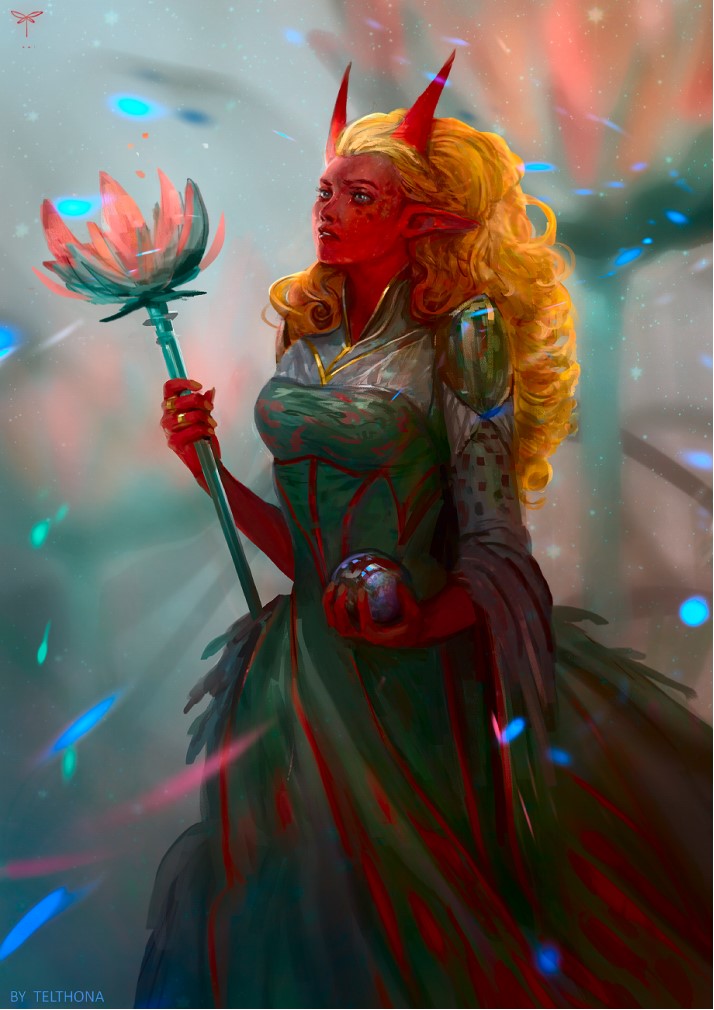 Я обернулся, девушка-тифлинг в явно дорогущей мантии с уровнем в трёхзначных числах. Невысокая, с красноватой кожей, задорно торчащими рожками и непослушной гривой золотистых волос[13] – Персефона, аколит.