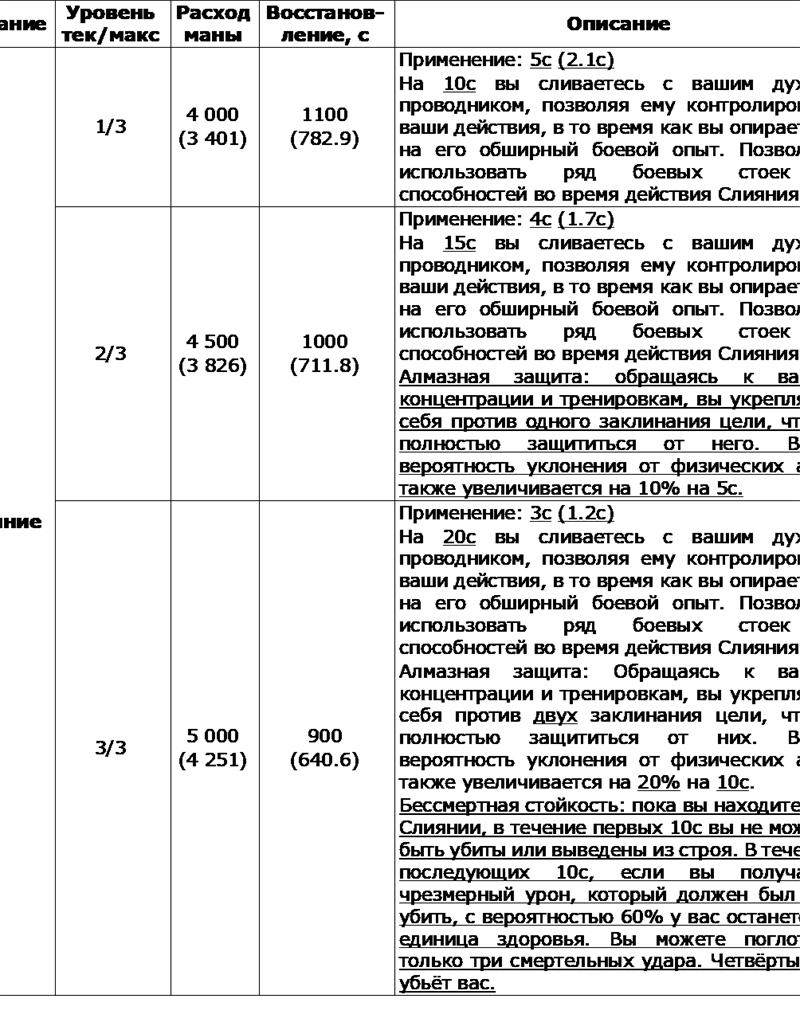 На 10с вы сливаетесь с вашим духом-проводником, позволяя ему контролировать ваши действия, в то время как вы опираетесь на его обширный боевой опыт. Позволяет использовать ряд дополнительных боевых стоек и способностей во время действия Слияния.