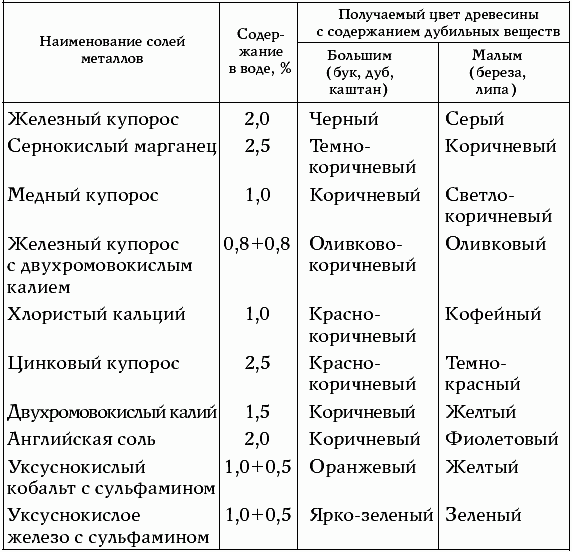 Протравы – медный и железный купорос, двухромовокислый калий, марганцевокислый калий и др. – применяют для имитации таких редких пород древесины, как черное дерево, серый клен, атласное дерево и др. Так, например, для имитации черного дерева древесину бука, груши или граба обрабатывают раствором железного купороса или уксуснокислого железа. Для имитации серого клена древесину березы обрабатывают сначала 5%-м раствором пирогалловой кислоты, а затем – 4%-м раствором железного купороса. Рекомендуемые составы для протравного крашения древесины приведены в табл. 1.