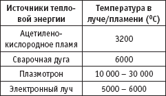 Вся история человечества связана с освоением энергии, в частности тепловой энергии. От древнего пламени костра до управления потоками света в лазерном луче – вот история технологии. В таблице 1 приведены данные о плотности потоков тепловой энергии и минимально достижимых площадях нагрева материалов, т. е. фокусировке потоков энергии в пятно нагрева.