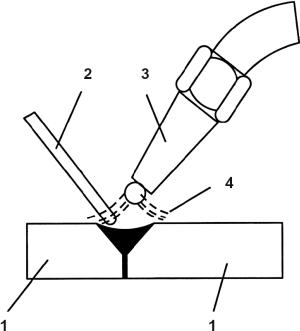 Сущность процесса газовой сварки (см. схему газовой сварки, рис. 2) заключается в том, что свариваемый и присадочный металлы расплавляются за счет тепла пламени (4) горелки. При этом кромки свариваемых заготовок (1) расплавляются, а зазор между ними заполняется присадочным металлом (2), который вводят в пламя горелки (3) извне. В качестве горючих газов применяются природные газы, нефтяные газы, а также водород, ацетилен, пары керосина и бензина и др. Наибольшее распространение получили сварка с использованием ацетилена, паров бензина, паров керосина, пропанобутана.