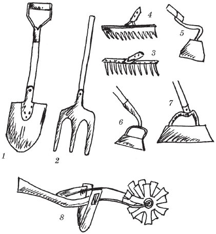 Для выполнения работ на участке необходимо обзавестись несложными орудиями труда (рис. 1). Важно, чтобы инвентарь был исправен, с хорошо подогнанными черенками и рукоятками.