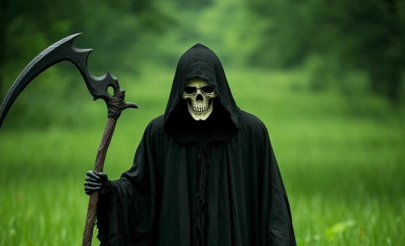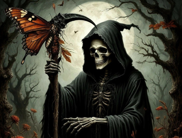 Комарик так и остался на лепестке цветка, и даже «ухом не повёл», когда грозная фигура в плаще с капюшоном приблизилась к нему своими пустыми глазницами.