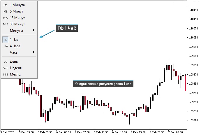 Например, 5М – период, равный 5 минутам. Каждая свеча в данном случае, будет формироваться на графике 5 минут.