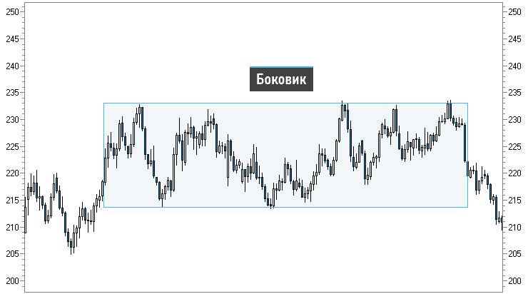 Боковое движение ценового графика. Ситуация когда цена консолидируется, не показывая четко выраженного движения вверх или вниз.
