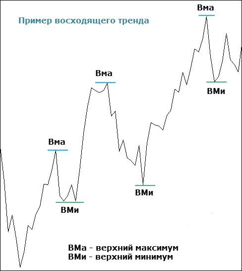 Если тренд идет вверх, то каждое максимальное значение будет больше предыдущего. Аналогично и для нисходящего тренда, где каждый минимум обновляет предыдущее минимальное значение.