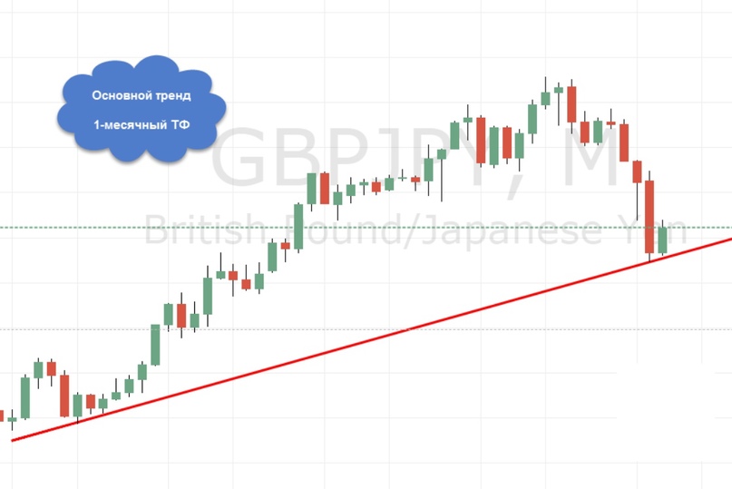 По теории Доу глобальный тренд длится 1-3 года что, впрочем, может меняться. Для скриншота ниже мы переходим на 1-месячный ТФ и рисуем линию тренда.