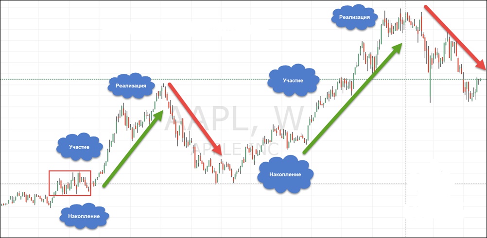 Это первая фаза, начало восходящего тренда. Именно на этом этапе инвесторы входят в рынок. Как правило, эта фаза начинается по завершению нисходящего тренда. К этому моменту большинство негативных новостей уже учтено рынком, за счет чего инвесторы, несмотря на низкие цены, начинают видеть в активе перспективу.