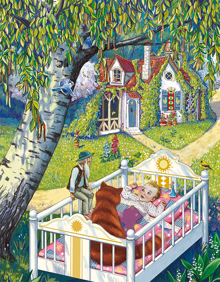 Когда ребенок уснул, а люди ушли по своим делам, Мышка Аришка, Домовой и Кот приблизились к спящему мальчику. Ветер раздувал пушок его волос, а ласковое солнышко бросало сквозь березовую листву маленькие лучики, которые играли на одеяле в догонялки.