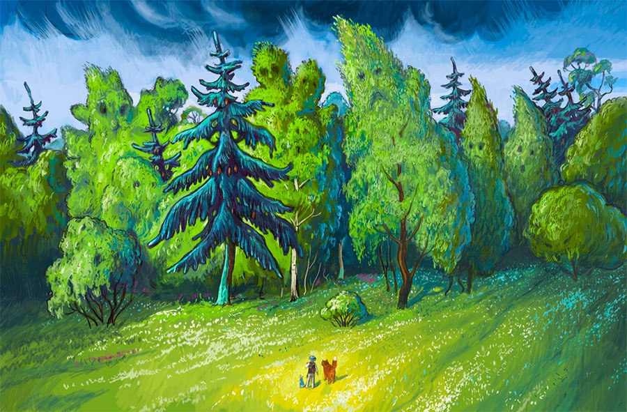 Домовой и Кот принялись всматриваться в чащу деревьев. Все вокруг потемнело, туча закрыла солнышко. Внезапно стало прохладно. Домовой прислушался: на поляне и в лесу стихли звуки, словно все птицы и насекомые попрятались, ожидая появления кого-то ужасного.
