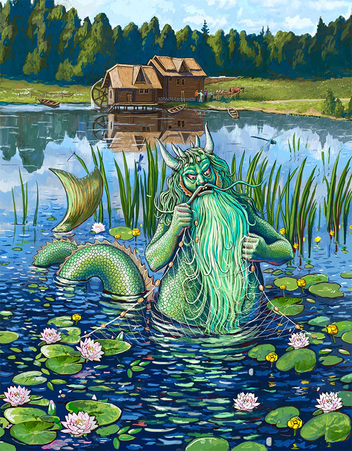 Но потом в том озере поселился Водяной, который никого не любил, а людей особенно. Вот и повадился он рвать сети у рыбаков, ломать колесо мельницы, пугать детей страшным голосом. А тех путников, что случайно ночью оказывались на озере, даже в воду утаскивал.