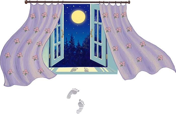 Домовой быстро спрыгнул с кроватки и бросился к подоконнику. Забрался на него и принялся всматриваться в темноту леса.