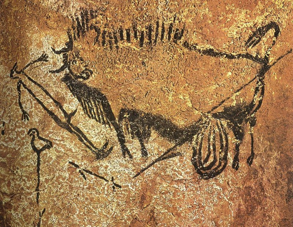 На этой картинке изображен исход сражения человека с буйволом. Человек лежит на земле, по-видимому, он мертв или умирает. Что изображает птичка, сидящая рядом? Может быть, это его душа или его тотем (прародитель его рода) прилетела побыть с ним в последние минуты его жизни? Но копье охотника пронзило живот зверя, из которого выпали кишки, и, увы, буйвол тоже погибнет. В страхе он оборачивается назад, увидев других охотников, убежать от них он уже не сможет…