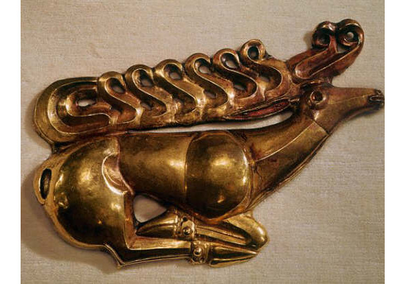Вот, например, скифский золотой олень, с такими же сказочными рогами, как его изображали в эпоху палеолита. Преемственность, если и не доказана, то почти несомненна.