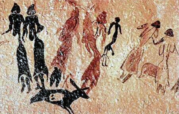 На этой фреске изображен, очевидно, какой-то древний магический танец, исполняемый женщинами. Их руки приподняты, наподобие птичьих крыльев. А женщина в центре изгибается, подчиняясь, очевидно, ритму танца. На головах танцовщиц, скорее всего, – маски. На втором плане изображен, кажется, ребенок и подросток. Ходят уже одомашненные (или, как говорят ученые, доместицированные) животные: вероятно, ослик и свинья. Это – мир первобытной Женщины, как бы центр общины. Здесь – магия, танцы, приготовление пищи, воспитание детей, приручение животных. И в те далекие времена уже существовала одежда: как видите, юбки – не изобретение XIX века.
