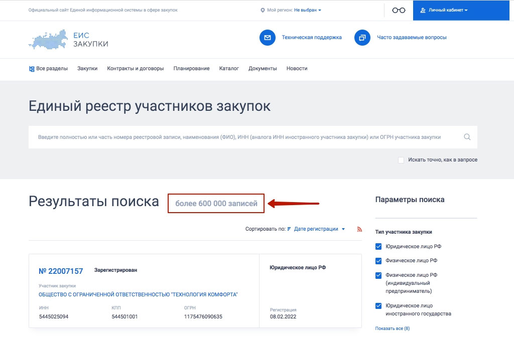 Если мы откроем Единый реестр участников закупок (ЕРУЗ) на официальном Портале закупок, то увидим, что регистрацию прошли более 600 тысяч участников. Это ваши потенциальные клиенты. База ЕРУЗ пополняется ежемесячно, что говорит о возрастающем интересе к тендерам.