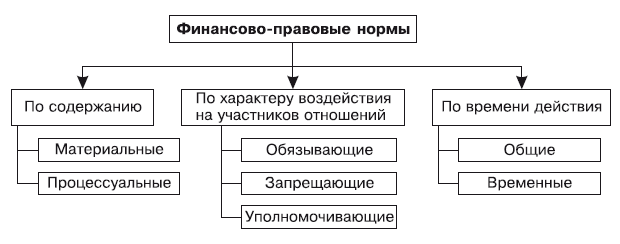 ♦ процессуальные (определяют порядок деятельности субъектов финансовых правоотношений, например, по прохождению бюджета).