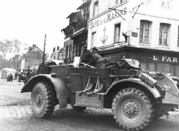 Командир 2-го канадского корпуса генерал-лейтенант Гай Симондс в штабном бронеавтомобиле у переправы через Сену в Эльбёфе.