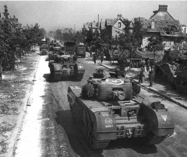 6 августа 1944 года инженерные танки «Черчилль» AVRE 79-й бронетанковой дивизии движутся через разрушенные предместья Кана к зонам сосредоточения операции «Тоталайз».