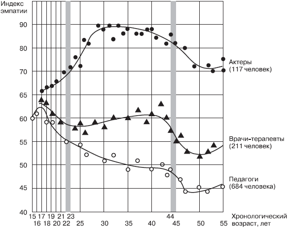 Рис. 2.1. Возрастная динамика индексов эмпатии для представителей различных коммуникативных профессий