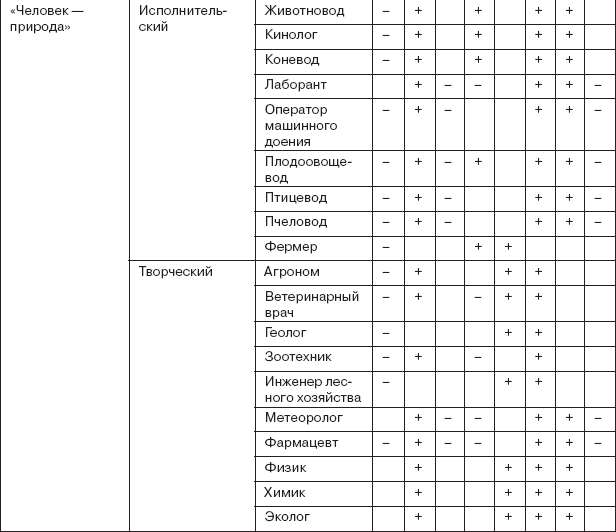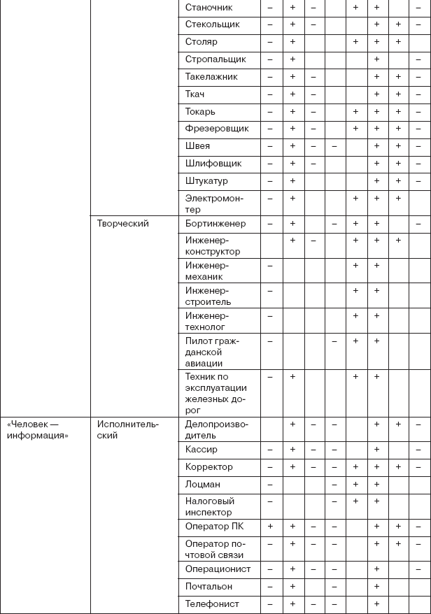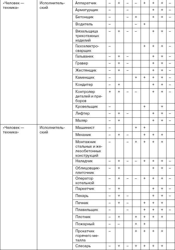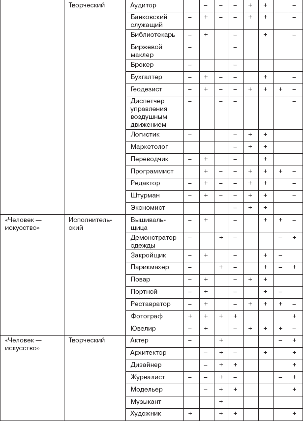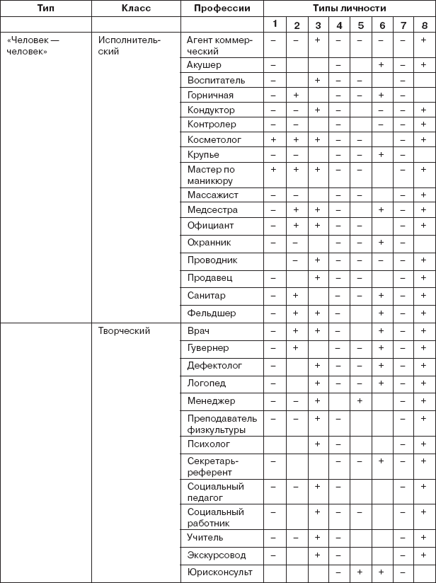 Примечания: 1 – чувствительный тип; 2 – дистимический тип; 3 – демонстративный тип; 4 – возбудимый тип; 5 – застревающий тип; 6 – педантичный тип; 7 – замкнутый тип; 8 – гипертимный тип. «+» обозначает, что представителям этого типа личности может быть рекомендована данная профессия; «-» обозначает, что представителям данного типа личности выбор этой профессии может быть не рекомендован из-за повышенной вероятности затруднений в процессе обучения и профессиональной деятельности; отсутствие знака свидетельствует о том, что представители рассматриваемого типа личности вполне могут выбрать данную профессию, особенно при наличии