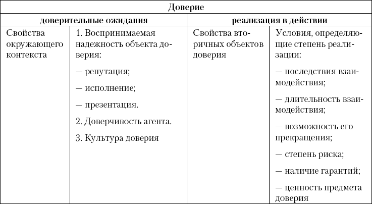 Основу доверительных ожиданий составляет оценка объекта доверия как надежного. Она, согласно представлениям П. Штомпки, складывается на основании трех основных источников: воспринимаемой надежности объекта доверия (т. е. свойств этого объекта), доверчивости агента и культуры доверия (табл. 1.2). О доверчивости и ее основаниях речь пойдет в гл. 4; культура доверия заключается в формировании определенных культурных норм и правил, которые способствуют повышению уровня взаимного доверия в обществе.