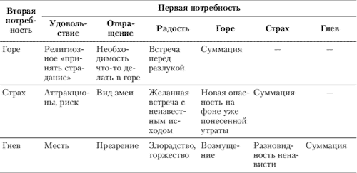 Возможно, ответом на последний вопрос может быть то, что помимо базовых положительных и отрицательных эмоций, проявляющихся в чистом виде, Симонов выделяет еще сложные смешанные эмоции, которые возникают при одновременной актуализации двух или нескольких потребностей. В этом случае, как пишет Симонов (1981), могут возникать сложнейшие эмоциональные аккорды (табл. 4.3).