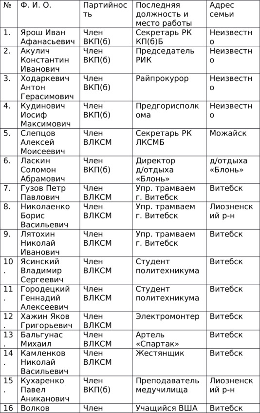 Естественно, уровень подготовки спешно создаваемых в Лиозно групп не мог быть удовлетворительным. Так, например, группа Яроша была сформирована в исключительно из гражданских лиц. Помимо самого Яроша в нее вошло еще несколько партийных и советских функционеров довоенного Борисова: уже упомянутый нами председатель райисполкома Константин Иванович Акулич, председатель горисполкома Иосиф Максимович Кудинович, прокурор Борисовского района Антон Герасимович Ходаркевич, директор дома отдыха Блонь Соломон Абрамович Ласкин, а также несколько комсомольцев из Витебской области, в основном – работников трамвайного депо Витебска и уроженцев Лиозненсого района20. Всего на момент организации в группу входило 18 человек. Упоминаемые в книге Памяти Крупского района 1-й секретарь Холопеничского РК КП (б) (в будущем) И. Т. Ламинский и секретарь Холопеничского райкома комсомола Екатерина Трипутень21 в списке группы Яроша не значатся, они присоединятся к ней позднее, уже на оккупированной территории, о чем говорится и в «официальной» части воспоминаний Константина Акулича22