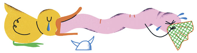 Он плакал так горько, что даже Червяк, у которого как будто бы имелись и свои причины для огорчения, разрыдался, глядя на него. Увидев рыдающего Червяка, Утёнок, Упрямый как Бык, не стал доедать его и сказал: