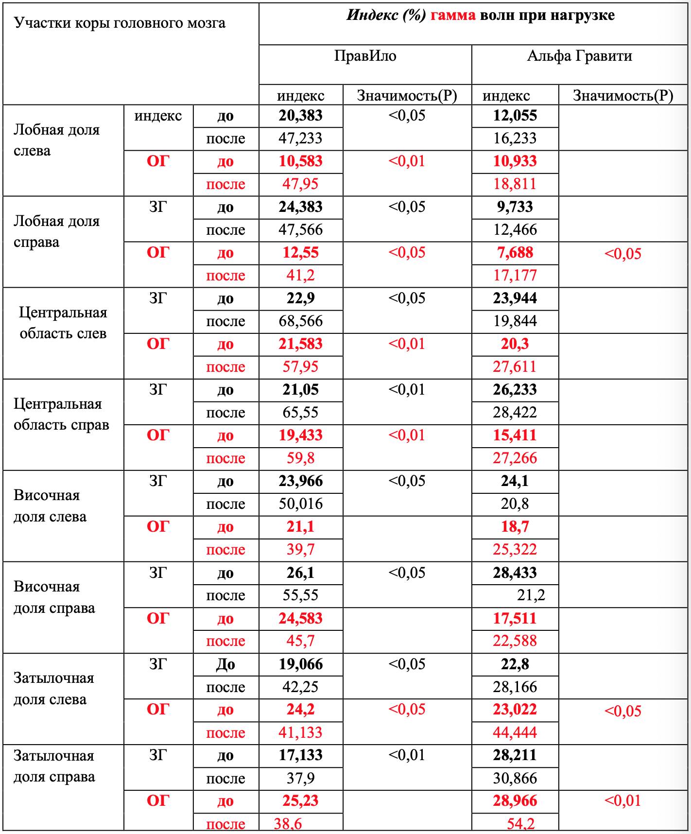 Динамика показателей электрической активности головного мозг в момент выполнения движений на правИло (в «струне») и Альфа Гравити. Представлены средние значения в экспериментальных группах.