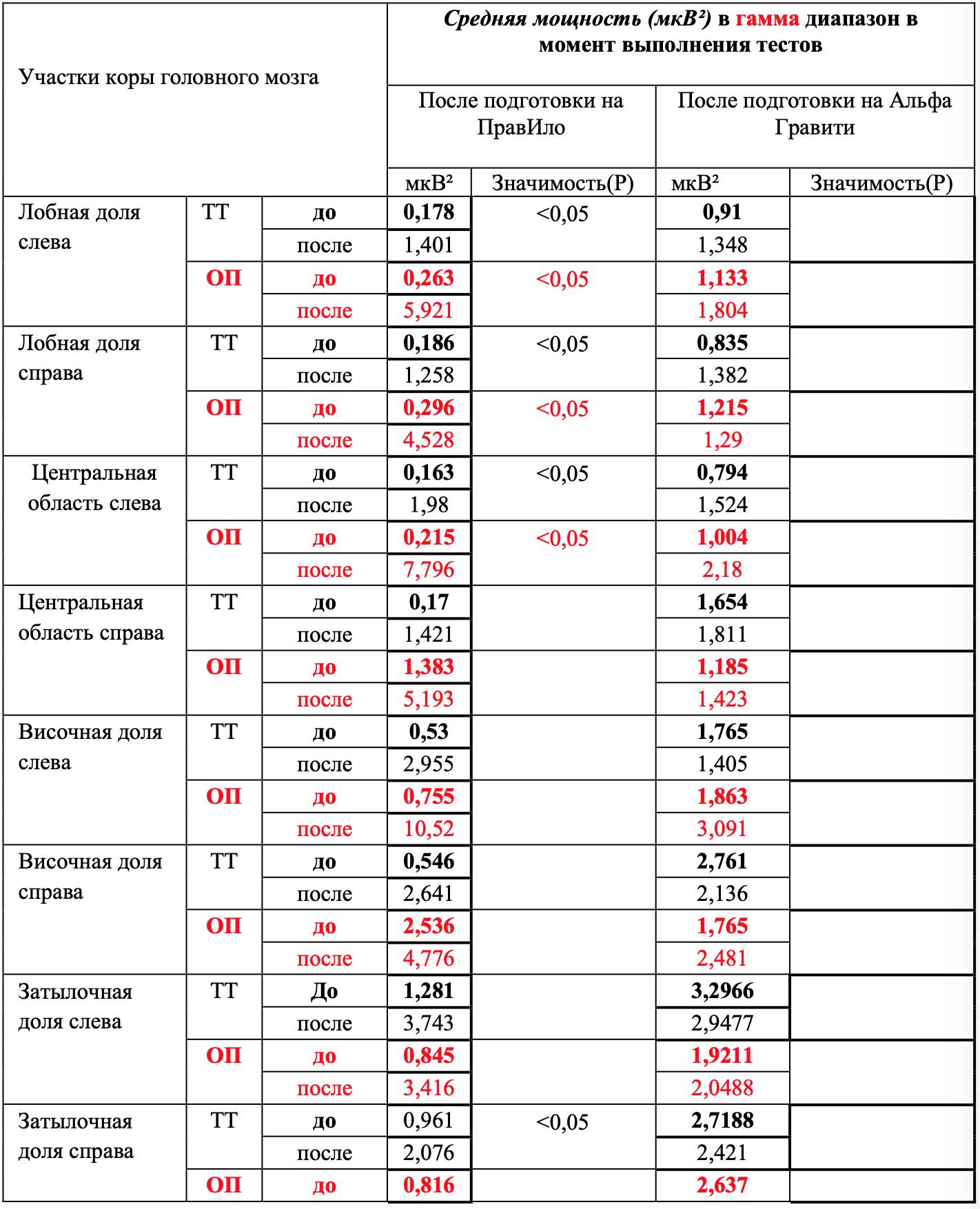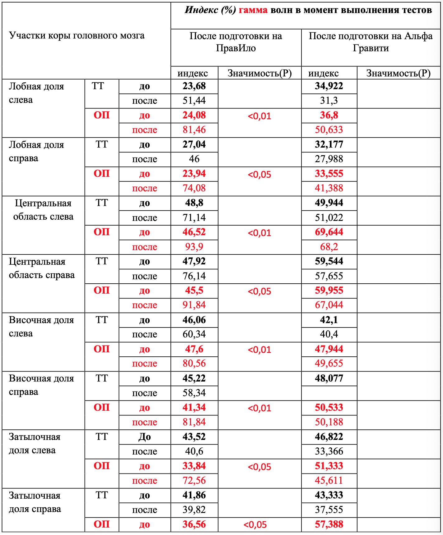Динамика показателей электрической активности головного мозга в момент выполнения теппинг-теста (ТТ) и теста на оперативную память (ОП)