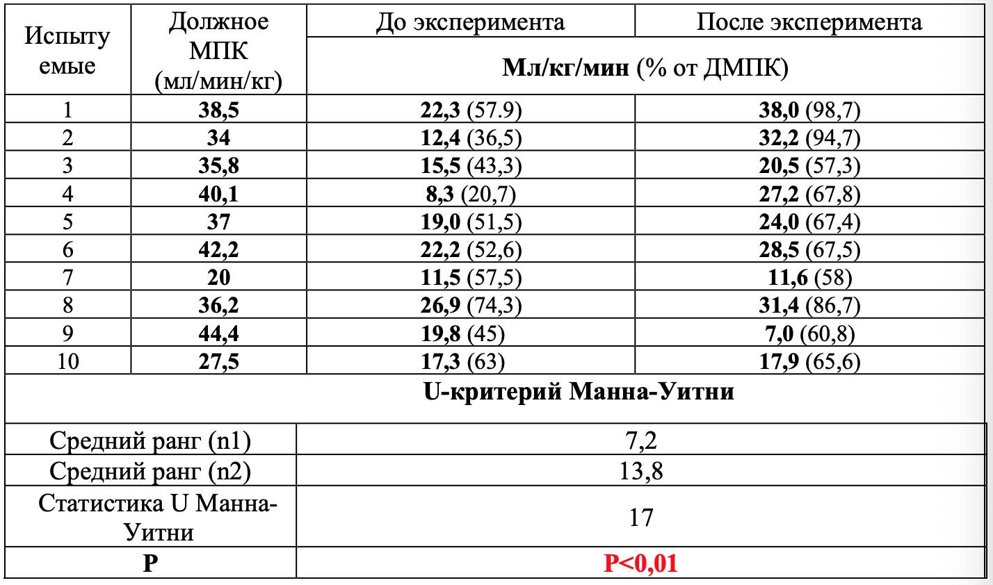 Должное МПК замерялось прямым способом на велоэргометре. Показатель повышается с вероятностью 99%