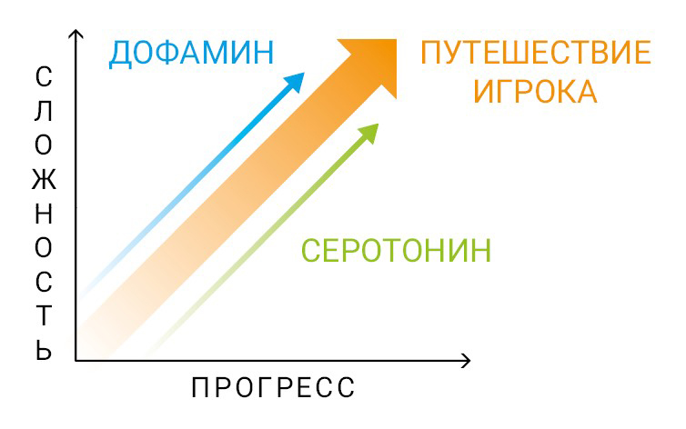 С точки зрения физиологии хорошая игра держит баланс между уровнем дофамина, адреналина и серотонина. Поэтому её сложность повышается очень плавно, по мере развития сценария или, как его ещё можно назвать, путешествия игрока (рис. 7, 8).