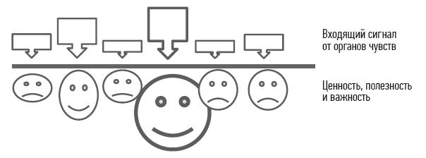 Каждый сигнал мозгу от органов чувств вызывает оклик, так называемое рассеянное внимание, но сила сигнала и сила обратной связи могут быть разными. Мозг обычно выбирает самый сильный сигнал и дает на него самую сильную реакцию. Внимание перестает быть рассеянным, оно концентрируется на сильном сигнале. Соответственно, чем он сильнее, тем выше его приоритет, тем больше внимания мозг уделяет этому сигналу, чтобы изучить его. В каждый момент времени в мозге работает система приоритетов, которая определяет, что важно, а что второстепенно.