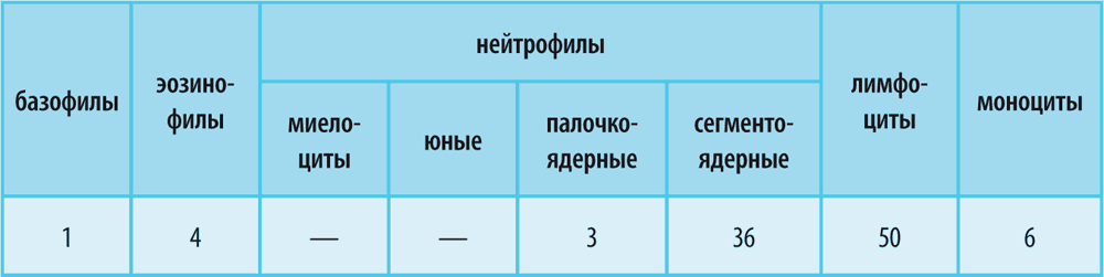 В здоровом состоянии защиту иммунитета обеспечивают зрелые сегментоядерные нейтрофилы и совсем немного палочкоядерных. Это видно и в приведенном бланке анализа крови: сегментоядерных нейтрофилов 47–72 %, а палочкоядерных 1–6 %.