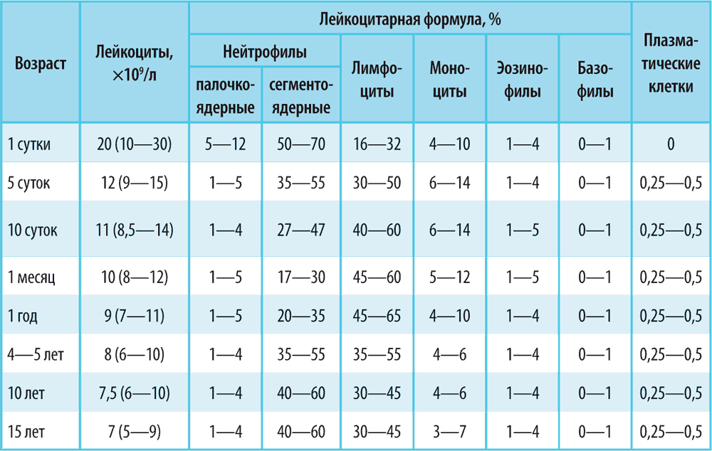 * * *Завершая рассмотрение темы лейкоцитов, приведем таблицу с нормальными показателями лейкоцитарной формулы в зависимости от возраста.