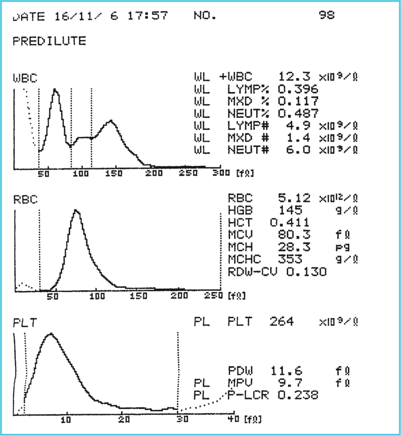 Гематологический анализатор – сложный, удобный, высокопроизводительный и не очень дешевый прибор. Он заправляется разнообразными реактивами, подключается к электрической сети. Внутрь помещается пробирка с капелькой крови, и через минуту аппарат выдает результат в виде бланка, примерно такого, как показано на рисунке. Точно и быстро анализатор определяет уровень гемоглобина и гематокрит, выдает информацию о форме, размерах и количестве эритроцитов, ретикулоцитов, лейкоцитов, тромбоцитов, рисует графики, отражающие частоту встречаемости форменных элементов и их распределение в зависимости от размеров, объема и т. п.