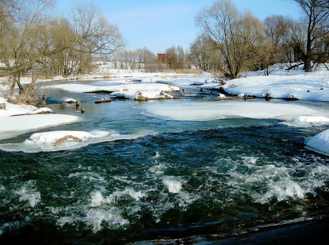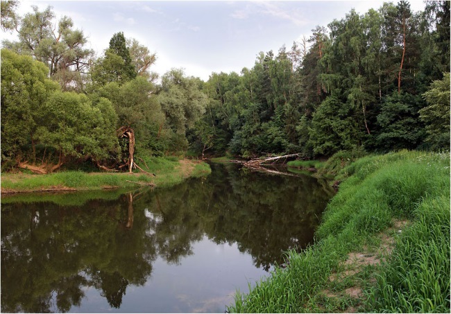 Так не широкая, с холодною водой,То мелкая, то очень глубока,Вся летом в зелени, а белая зимой,Теченьем подмывает берега.Река водоворотами кружит,Но тихие бывают здесь места,А испугавшись грохота, бежит,Под сваями железного моста.Потом омыла корни у ветлы,И словно замерла в широких омутах,Скрывая под водой огромные стволы,Развесив тину как вуаль на всех ветвях.Сказали, что русалки здесь живут,И даже могут в омут заманить.Так вот услышишь, как они поют —Все позабудешь. Могут погубить.Плотина старая, высокий перекат,Так узко, что напор, струя бежит.Тут вышел рукотворный водопад,И плещется вода, шумит, шумит.А раньше колесо вращалось здесь.Гремя, муку мололи жернова,И важный мельник белый, белый весь,Ходил по локоть засучивши рукава.Проходит все, нет мельницы в помине,Лишь бревна из запруды все торчат,Но на песчаном дне, что прямо у стремнины,Все также стайкой окуни стоят.Большой России малая река.Бежит, течет через века и годы.То мелкая, то очень глубока,Несет свои святые воды.