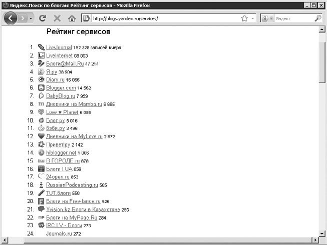 Рис. 1.1. Рейтинг блогохостингов «Яндекса» Преимущества блогохостингов