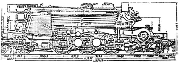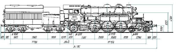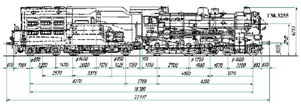 Разрез турбовоза T18—1002 по котлу с размерами (в старом ГОСТе). Вид сбоку.