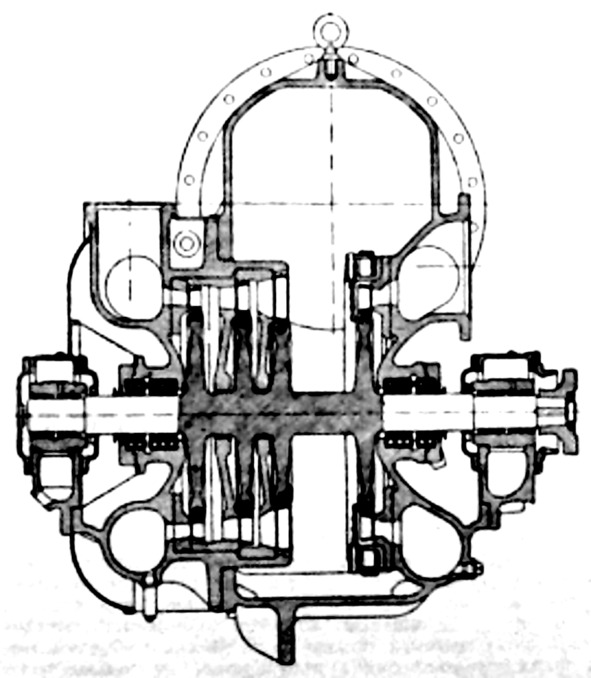 Турбина низкого давления сконструирована с тремя ступенями для переднего хода и с одной ступенью для заднего. Давление от 1,1 до 1,4 ат в паропроводах, соединяющих паровую машину с турбиной, поддерживается при всех нагрузках при помощи регулятора давления.