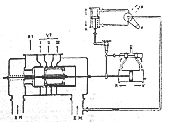 КМ – поступление пара от поршневой машины; VT – проход для пара по трём каналам I, II и III в турбину низкого давления переднего хода; RT – проход для пара к турбине низкого давления заднего хода; V – положение при ходе вперед и R – положение при ходе назад. Когда давление в соединительной трубе слегка увеличивается, цилиндрический золотник открывает последовательно три группы упомянутых каналов I, II и III при помощи масляного сервомотора. Турбина низкого давления переднего хода отделена от турбины заднего хода при помощи двухседельного клапана, не пропускающего пар. При перемене хода с переднего на задний одновременно с перекидкой парораспределения поршневой машины производится перестановка клапана изменения хода турбины низкого давления из положения V в положение R. Вследствие этого цилиндрический золотник закрывает три группы каналов, ведущих в турбину низкого давления переднего хода, и двухседельный клапан начинает отжиматься от своих сёдел концом штока цилиндрического золотника, причём противодействующая этому пружина сжимается, и таким образом канал, ведущий к турбине заднего ходя, оказывается открытым. Предохранительные клапаны, размещённые на маслоотделителях, не дают возможности во всех случаях давлению в соединительной трубе сделаться чрезмерно большим, каковое может, например, иметь место в случае полной выкладки при спущенном рычаге у паровой машины.