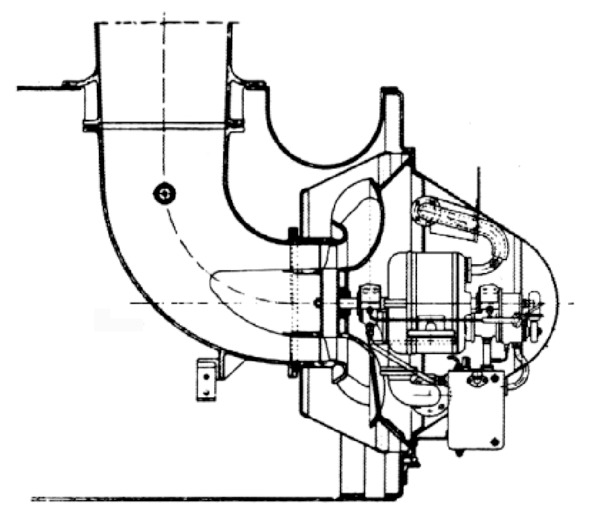 При атаке на лопатки вентилятора Бетца отработавшие газы поворачиваются на 180° изогнутым входным диффузором, а затем направляются под прямым углом вверх в дымоход. Заглушка большого размера, расположенная сразу за вентилятором, является выходным диффузором для повышения эффективности вентилятора. Большое U-образное углубление над вентилятором содержало, вероятно, нагревательный бак питательной воды.