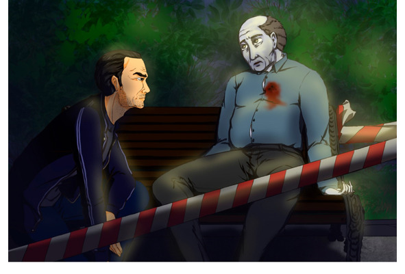 Он здоровается со мной за руку, затем поднимает одну из ограждающих лент. Уже темнеет, перед нами скамейка, на ней труп, два огнестрела в сердце. Рядом со скамейкой включился уличный фонарь, свет от него под углом падает на труп.