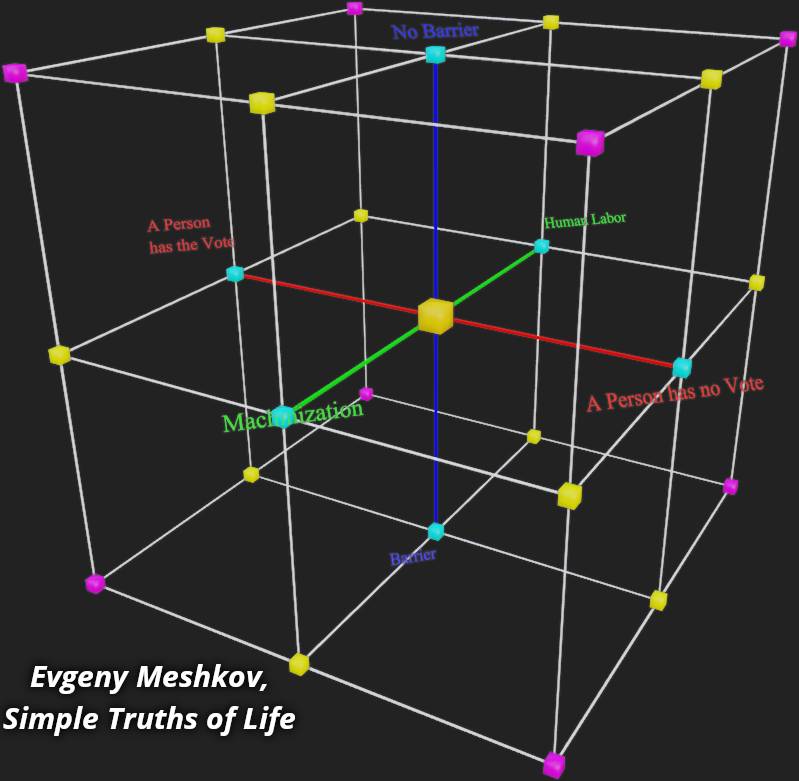 Why my “3D Social Graph” (You can download my 3D graph file from my cloud storage.[29]), as I called it for myself, might be important here? This graph simply depicts all the physically possible ways of organizing society; it is impossible to go beyond that graph’s boundaries. And the boundaries themselves outline a cube – a form within which there are all possible ways to organize society in the Universe.