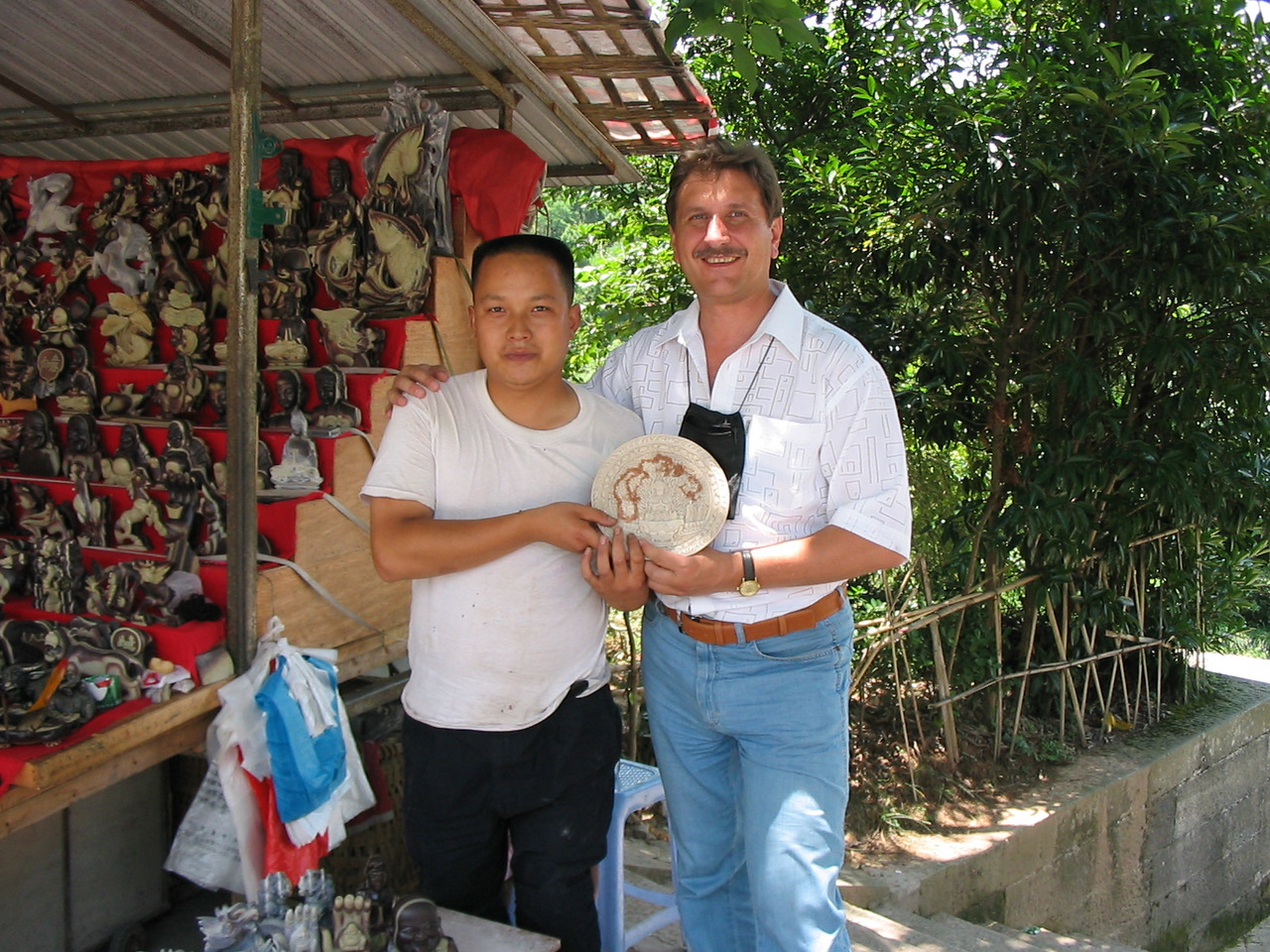 На выходе мы попали в окружение местных торговцев, продающих различные сувениры, изготовленные из камня: декоративные блюда, фигурки основных персонажей буддизма и многое другое. С учетом «распространенности» английского языка в провинциальном Китае и обилия туристов из разных стран, призывные возгласы торговцев звучали примерно так: «Hello! Buddha!» или, например, «Hello! Stone!» Если потенциальный покупатель заинтересованно останавливался, то вступал в действие язык мимики и жестов, а также калькулятор со скачущими, как зайцы, цифрами.